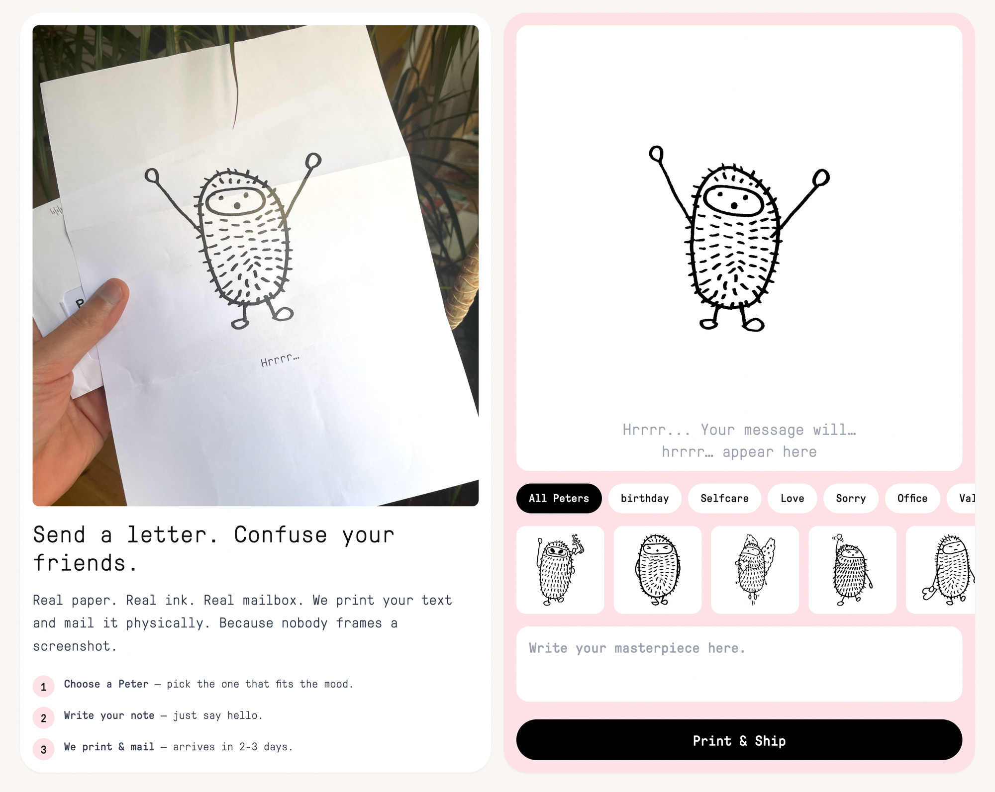 Another cool thing is the "Send A Peter" feature. You can send a real letter on paper to someone you love or want to confuse. Pick you Peter, write a small note, and after 3 days, that person will have a Peter in the mailbox at home.