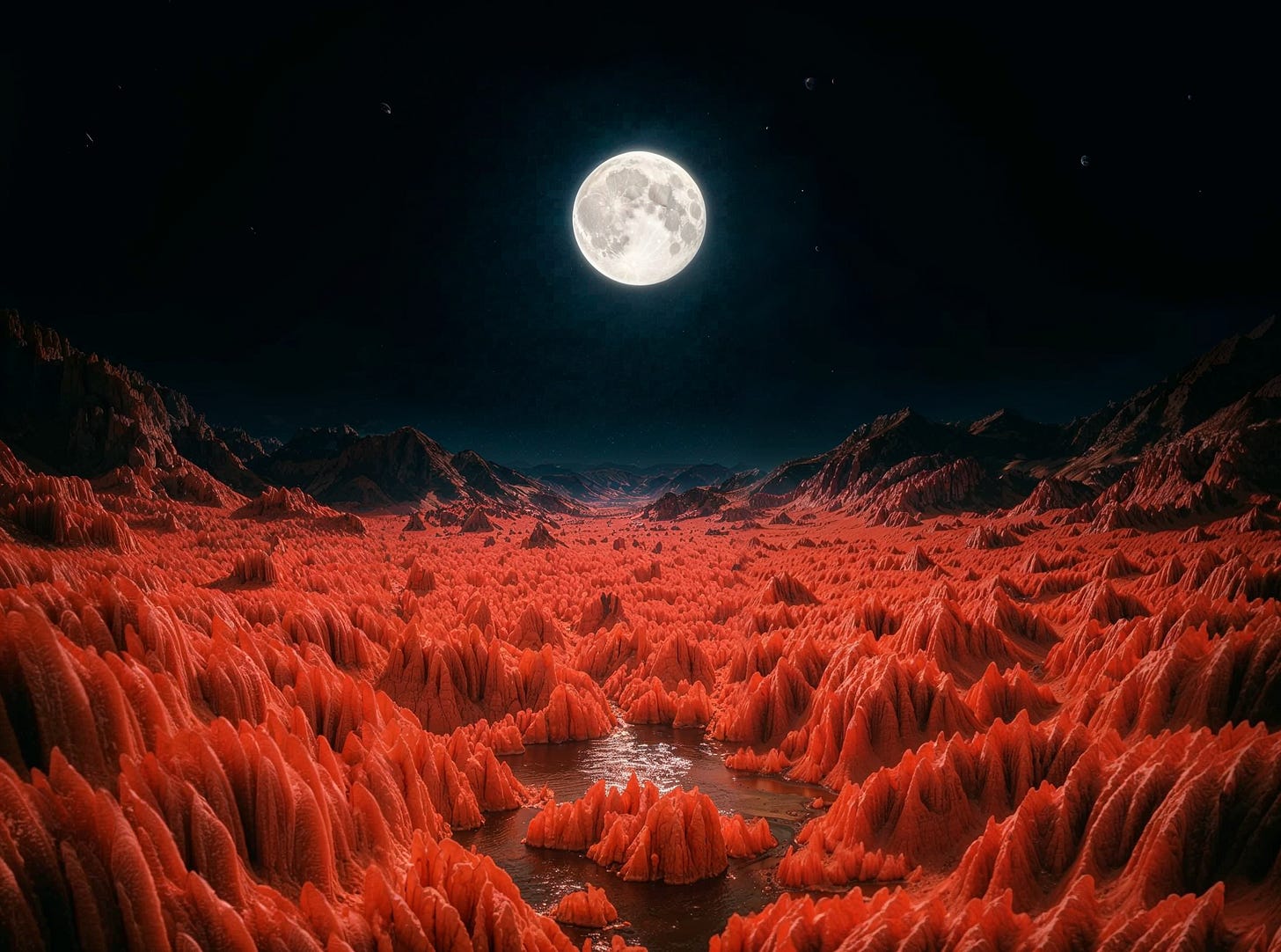transform this to a landscape with black sky and bright big moon. make it mystical and cinematic, keep the bight colors in the foreground, the landscape should be even more bright, there should be a very surreal contrast between the bright saturated landscape and the dark background